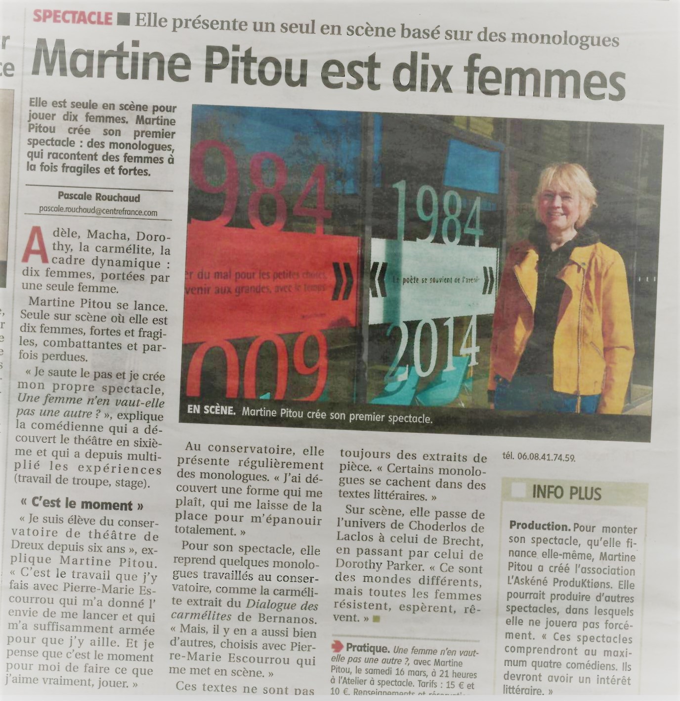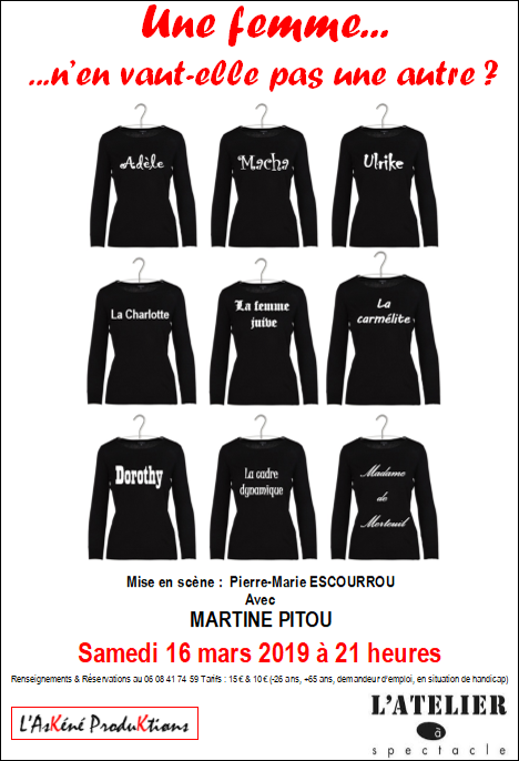 Chacune d’elles va espérer, rêver, maudire, résister, s’abandonner, se déchirer, se libérer, tour à tour… Tout un programme jubilatoire,bouleversant mais tellement féminin. Seule en scène, Martine Pitou se glisse dans la peau de toutes ces héroïnes anonymes de la vie…